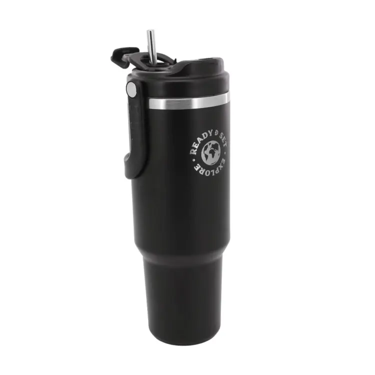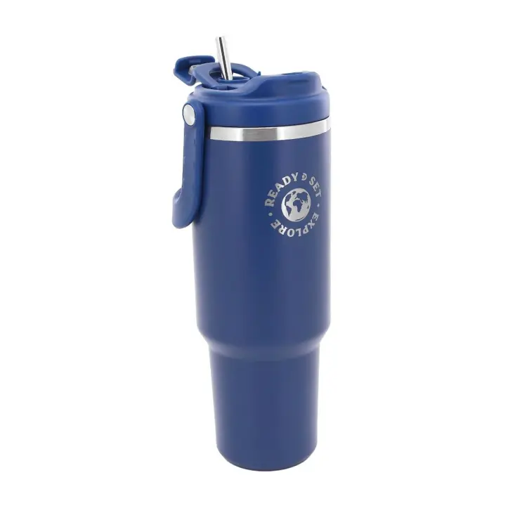 Composicion: Botella cuerpo interno 100% de acero inoxidable AISI 304L y cuerpo externo 100% de acero inoxidable AISI 201. Tapa interna a rosca y asa de plastico.