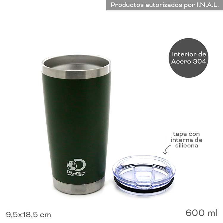Medidas: 9,5×18,5 cm Capacidad: 600 ml Autorizado por INAL Material: Vaso: Acero Inoxidable doble capa, Capa interna 100% AISI304 y capa externa 100% AISI201. Revestimiento Externo de pintura 100% Poliéster. Tapa: Tapa hermetizante con pico y tapa de pico 100% polipropileno, burlete 100% silicona